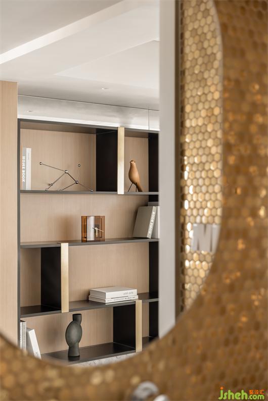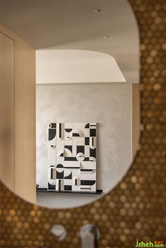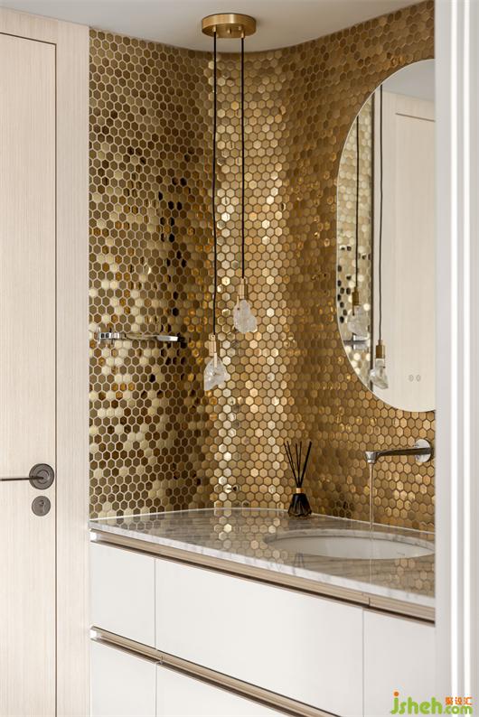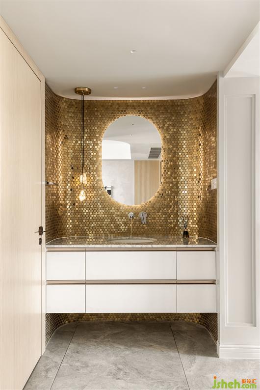 金色马赛克的整面内弧形背景墙与圆弧发光镜的融合,将肌理、灯光、质感等元素融合在一起,花漾美作营造出精致到恰到好处的氛围感空间。