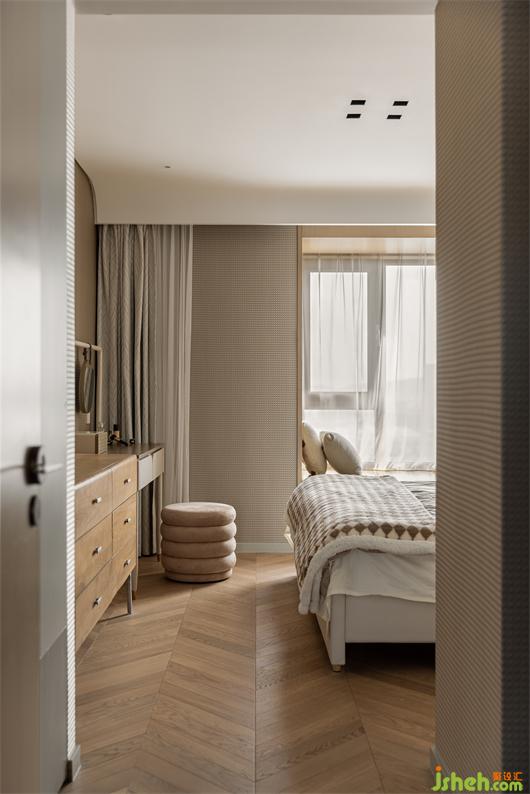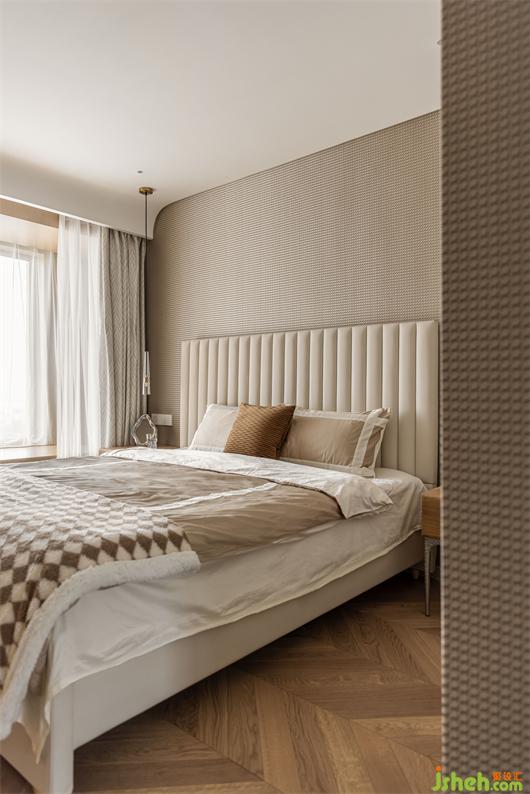 主卧选用最暖人心脾的大地色系进行搭配设计,肌理感的墙布,温润木色系的家具,花漾美作在温柔色调的滤镜下,让空间展现出温润宁静,岁月静好的模样。白色皮质床背靠,晶莹剔透的灯具和柔和的纱幔窗帘结合将质朴的宁静与时间消逝的美留存于空间,通过设计营造舒适安心的自然氛围。