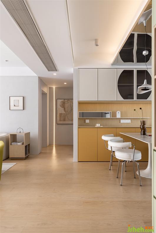 1.入户利用墙面原始结构凹陷打造鞋柜及冰箱等电器高柜,释放厨房操作空间