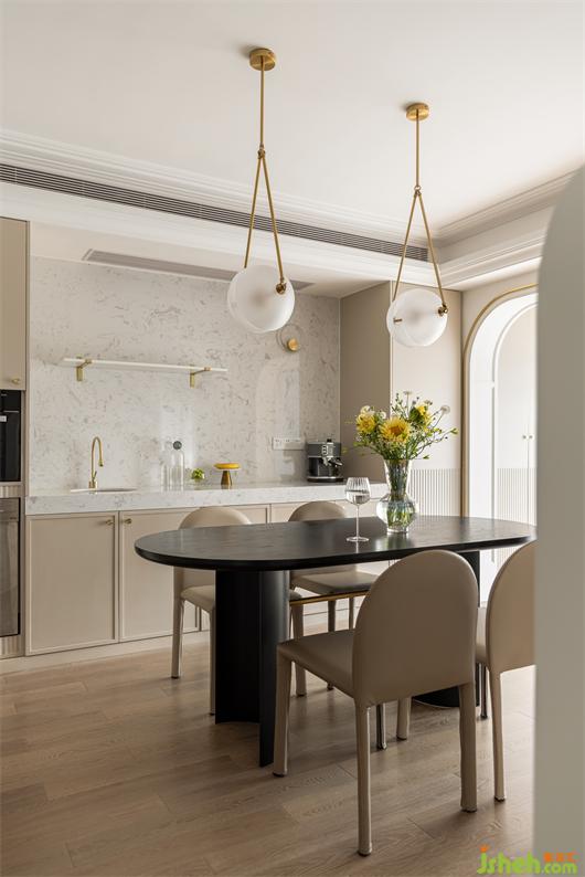 餐厅空间是原结构的客厅位置,我们将餐厅与落地窗阳台做融合,花漾美作将最好的采光给到餐厅,拱形门套框出窗外美景,西厨外置在餐边柜一侧,功能性与美观性兼具,现代风格的餐桌椅与美式硬装相结合,营造轻复古、内敛、温润的空间氛围。