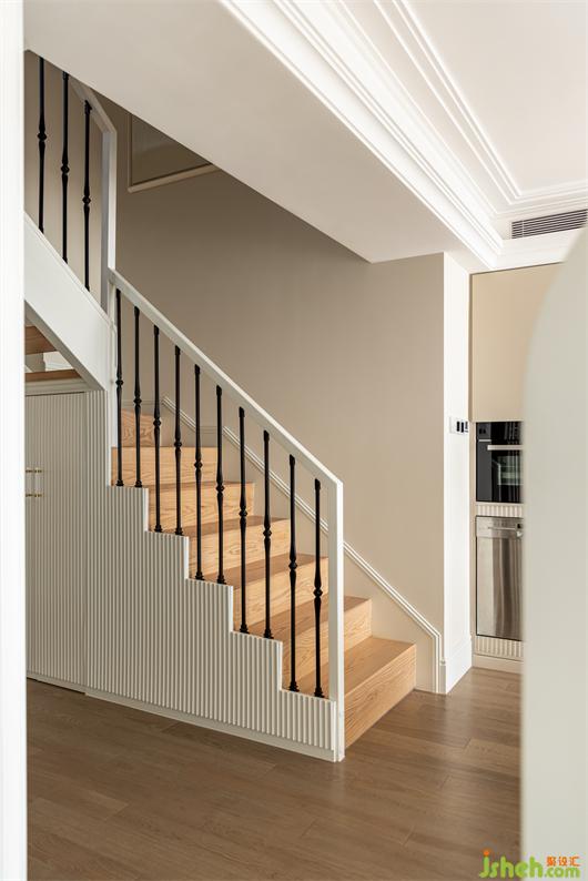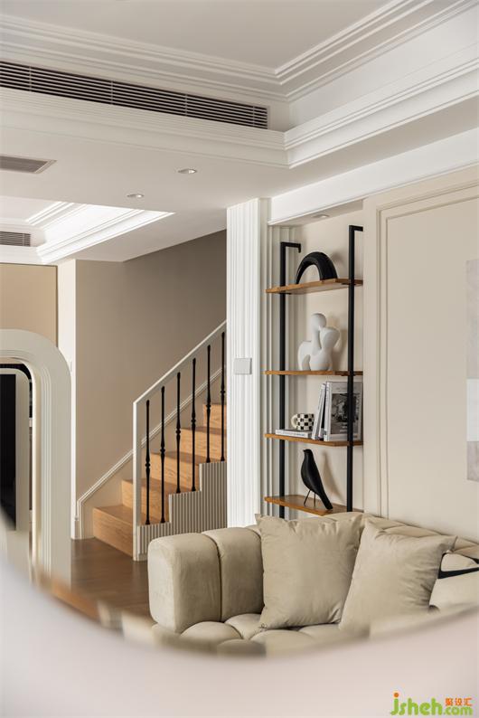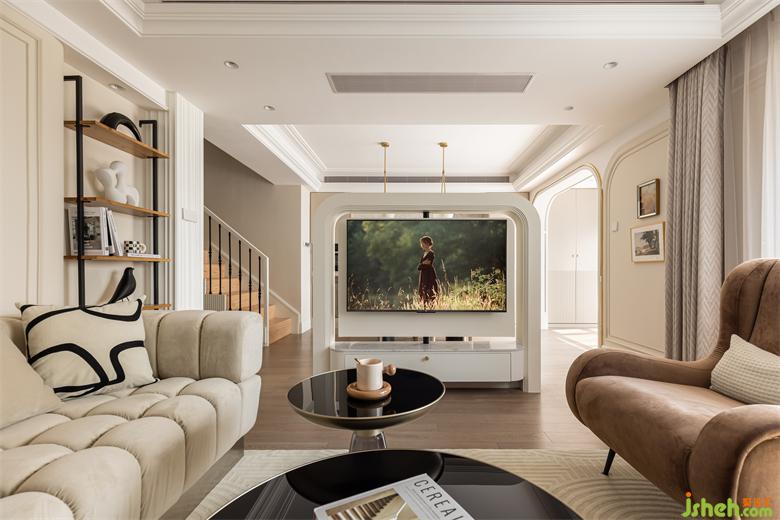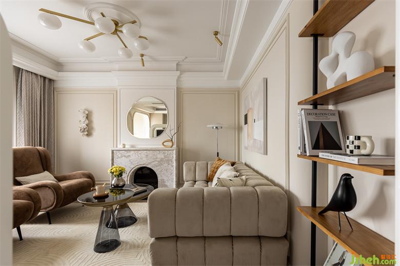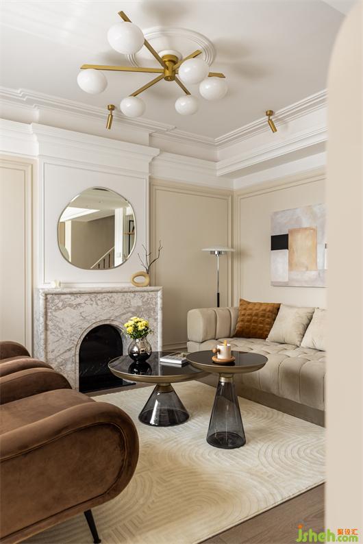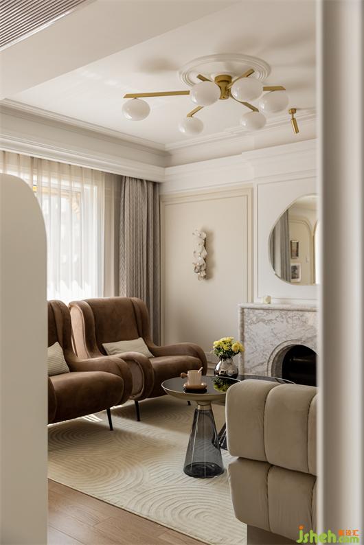 客餐厅之间设置一个360°旋转电视架,花漾美作运用了中轴对称的设计理念,与大理石装饰壁炉相呼应布置,客厅围合成经典的对坐形式,高低组合镜面质感的茶几现代时尚,木层板和铁艺钢架组合的展示架让整个精致的空间增添了些许休闲氛围。
