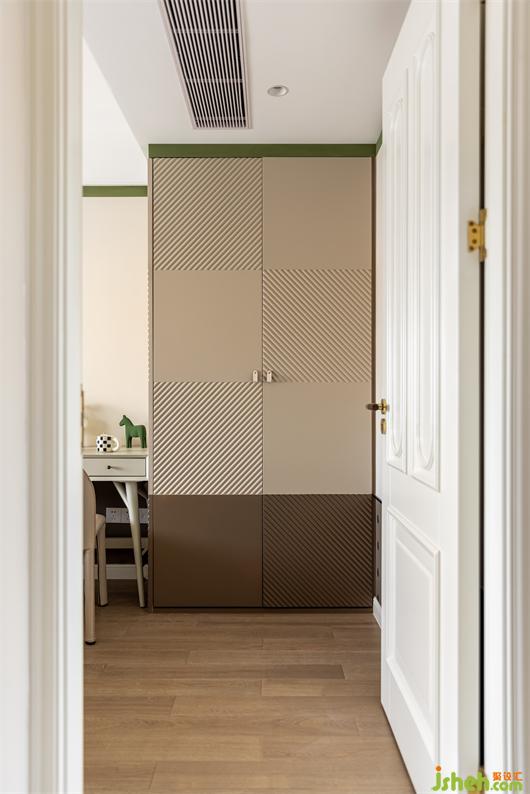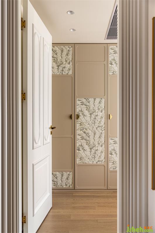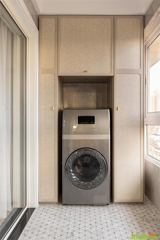 阳台地面选用跟厨房卫生间一样的三角形大理石马赛克地砖,配上浅咖色的门板,门板上的的弧角修边,花漾美作让原本功能性的空间柔和的恰到好处,内凹的编织纹壁纸饰面让原本单调的门板复古了起来。