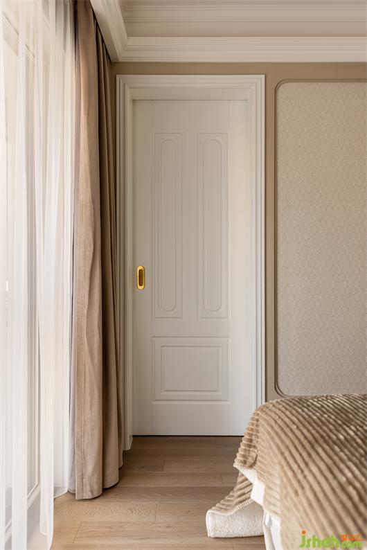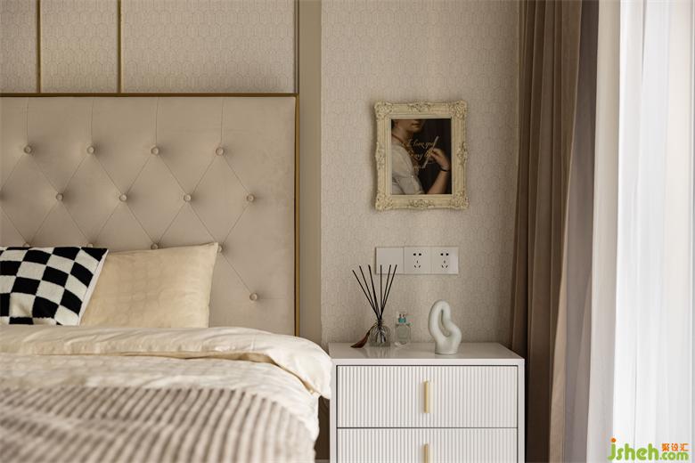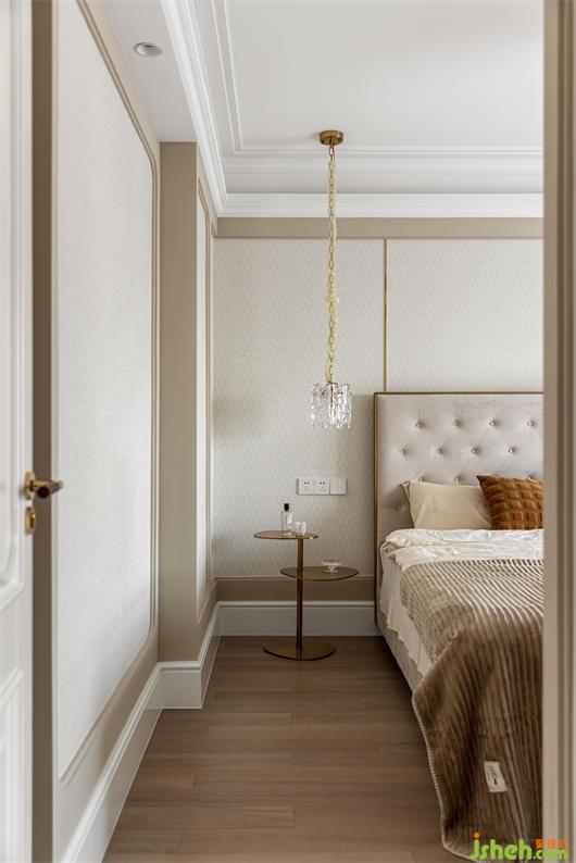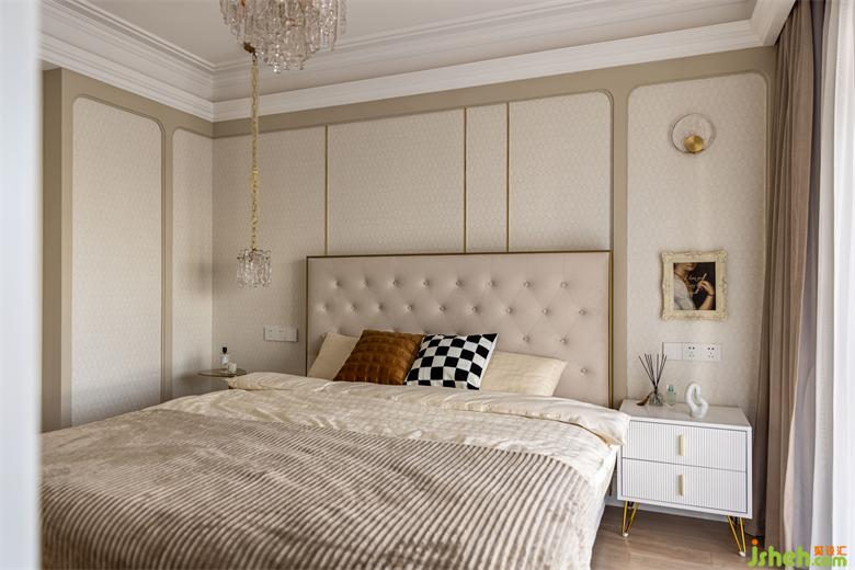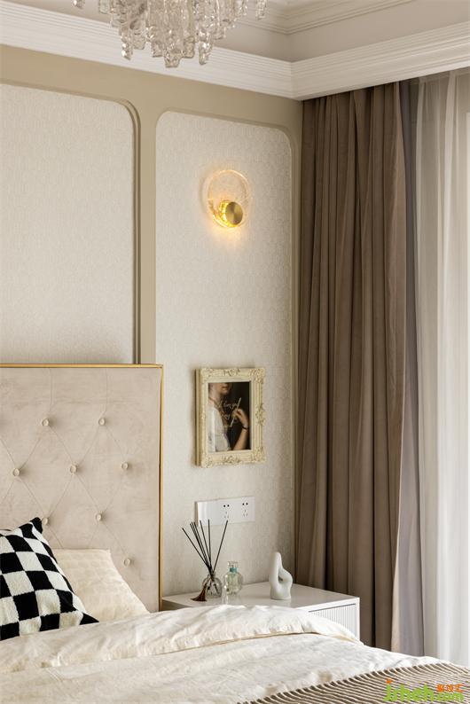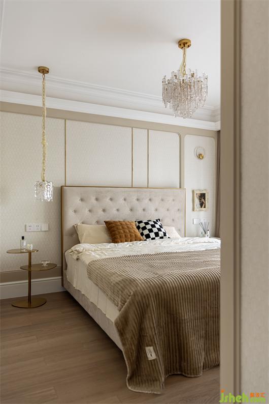 主卧是客餐厅的复刻,美式复古的硬装和现代轻奢家居的融合,圆弧角的背景凹凸叠级作为装饰护墙板,内凹的浅纹壁纸饰面丰富了墙面的层次感,床背景几根不锈钢装饰条的不规则排布,让背景细腻有致,现代感的轻奢家具陈列,花漾美作为复古的底妆空间增添了精致度,朦胧梦幻的水晶吊灯更是营造出晶莹雅致的浪漫氛围。