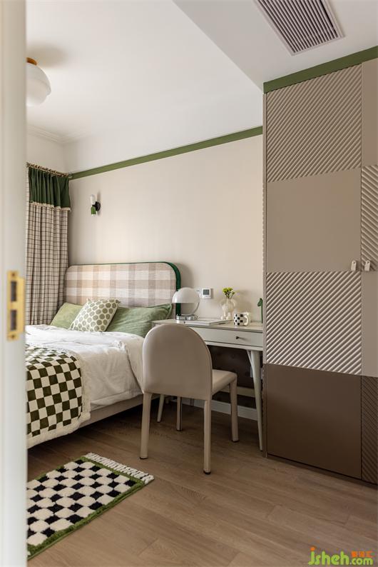 儿童房延续公共空间的主色,选配深绿+深棕的搭配,顶圈围合深绿的勾边,下墙群搭配波点棕色壁纸,让整个空间构建出童趣感,球状的顶灯和壁灯呼应了波点元素,波纹状的方块门板像拼图一样组合,简单的衣柜也带有美观的装饰感,灰格纹背景的床背与黑条格纹的窗帘,以及床品和地毯都形成了元素的相互呼应,三联拱形书柜背板同样搭配了波点壁纸,儿童房面积虽迷你,但是却能兼顾功能和美观,给孩子创造一个趣味美好的成长环境。