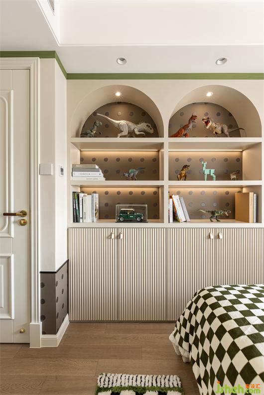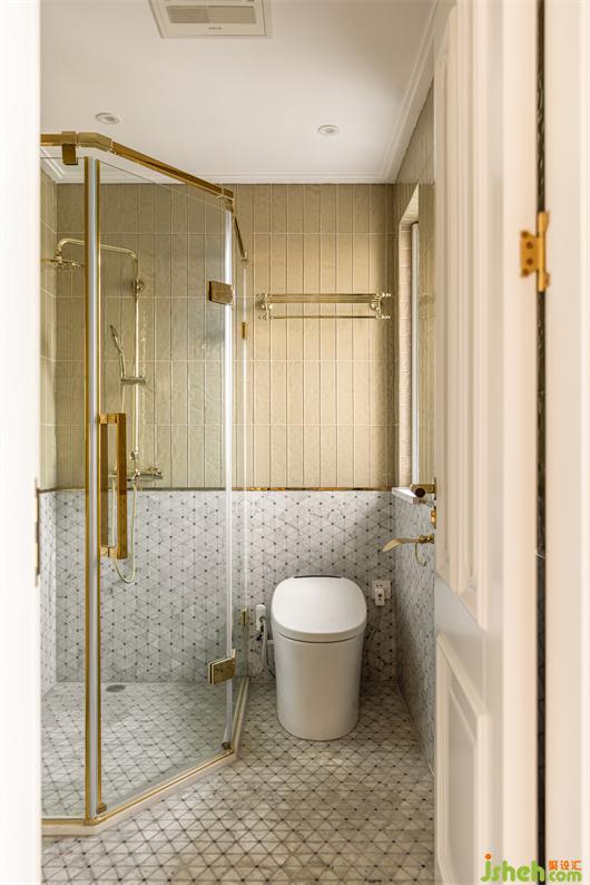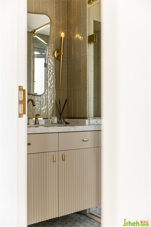 主卫用卡其色作为主色,墙面跟客卫一样,也采取上下分割的方式,下墙裙与地面用同款马赛克材质整铺,花漾美作让空间有种包裹感,上圈用卡其色通透的玻璃砖竖铺,拉高层高视觉感的同时为空间增加了灵动的美感,金色花洒、金色壁灯、金色铜镜让整个空间精致复古味十足!