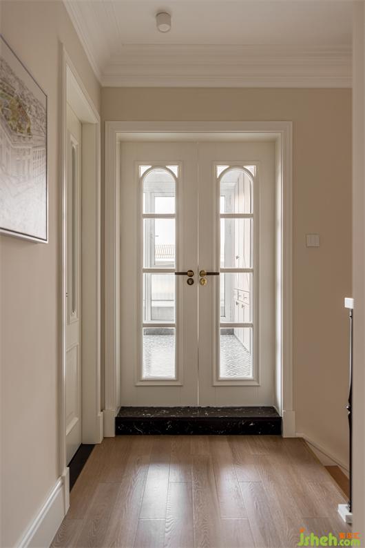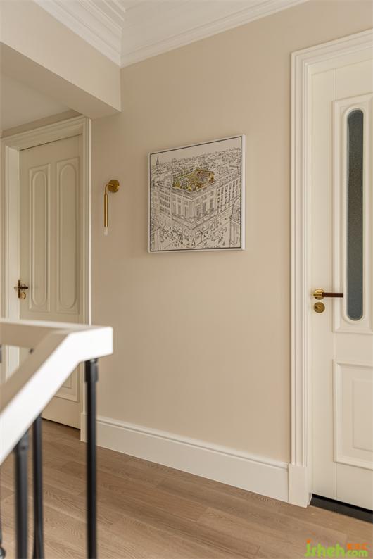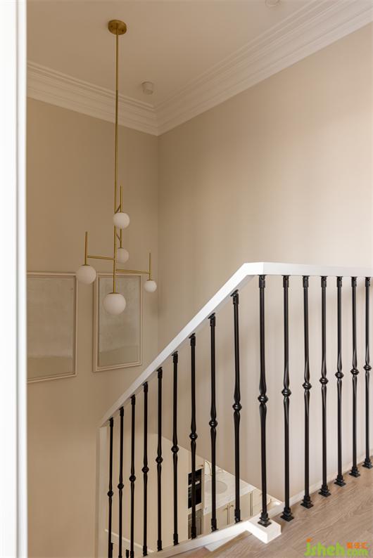楼梯间接着阳光房,双开门全通透的设计,将光很好的引入楼梯间,加长杆的金色球灯,花漾美作结合装饰画的组合,让楼梯间的艺术气息瞬间升华了,铁艺栏杆扶手优雅排布,为整个空间增添了优雅的仪式感。