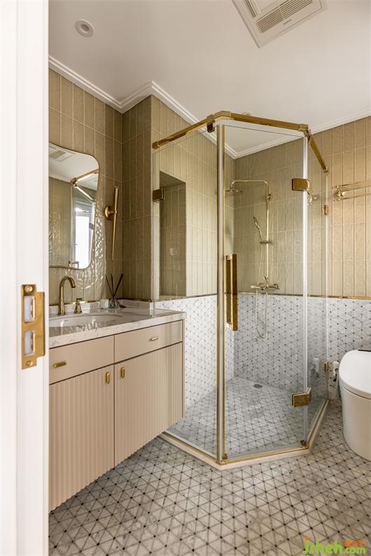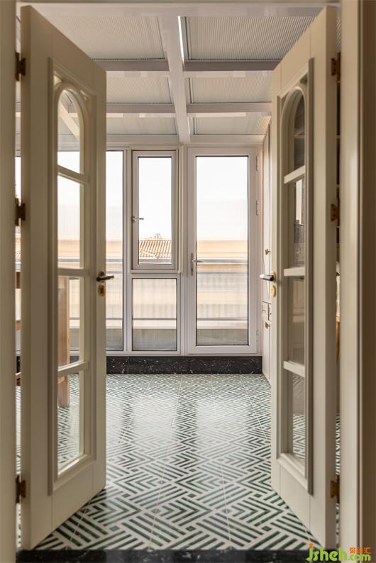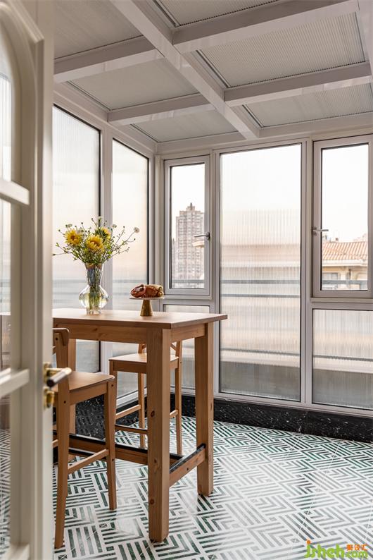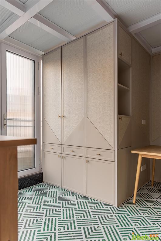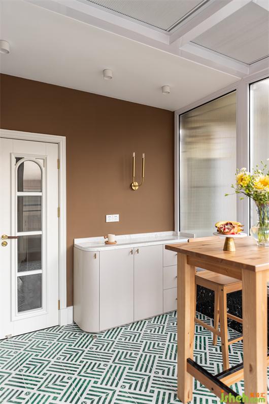 阳光房整墙顶几乎都是玻璃,让这个空间充享受了阳光的洗礼,长虹玻璃取代窗帘,让光透进来的同时又很好的保护了业主的隐私,白绿相间的几何图案地砖趣味拼贴,摩卡色的墙面涂料为空间增贴些许南洋度假风味,内凹的编织纹壁纸饰面让原本单调的门板复古了起来。在这里跟家人畅享午后的休闲时光,多么惬意美妙。