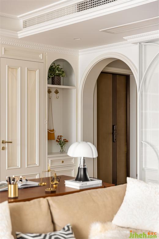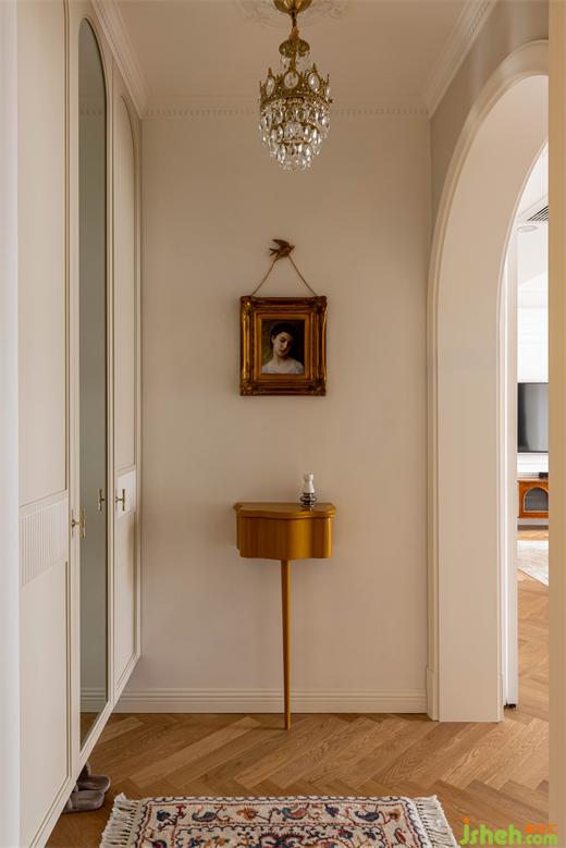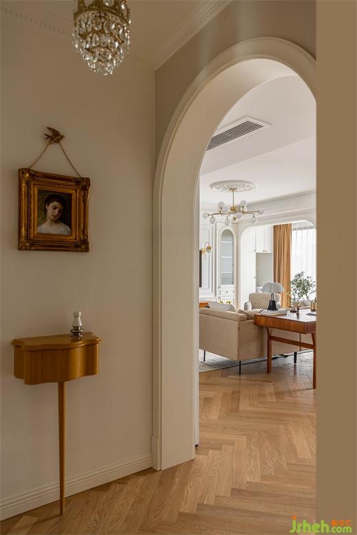 入户正对的是法国画家布格罗的女孩肖像油画,做旧画框与下方姜黄色的Zanotta单腿柜相呼应,南京装修设计公司紧抓视线焦点,给人奇妙的感官体验。法式拱门的优雅弧线将一丝灵动带入这个方正空间,也为步入客餐厅空间增加了仪式感。