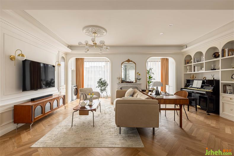 不同于传统客厅布局,围合式沙发布局与沙发后的开放式书房构建出整体开放式的客厅区局,南京装修设计公司增加了客厅的流动性,家具可以按需自由摆放,无论阅读、弹琴还是围坐聊天,都可感受到空间带来的舒适与惬意。
