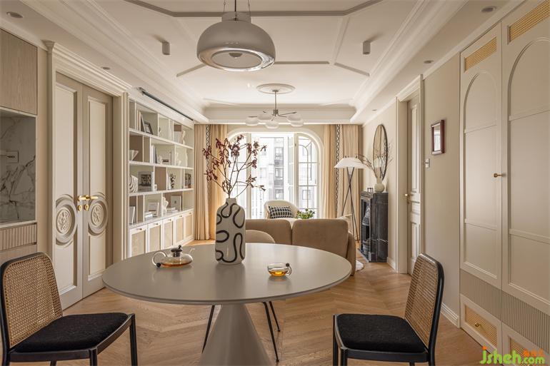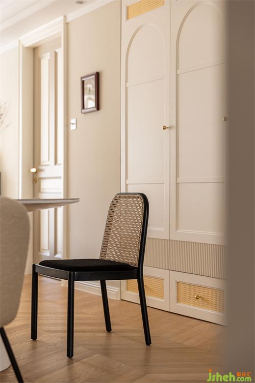客厅书架奥松板现场制作,结合木雕花线条现场刷油漆,藤编柜门板工厂定制,花漾美作点缀了几个竖隔板贴木饰面与餐边柜做呼应,如此复杂的工序最终呈现了层次丰富、极具观赏区的书柜。