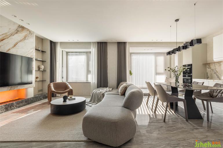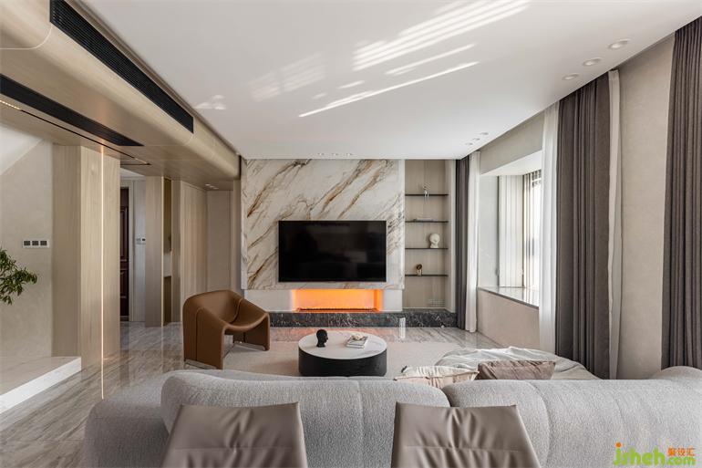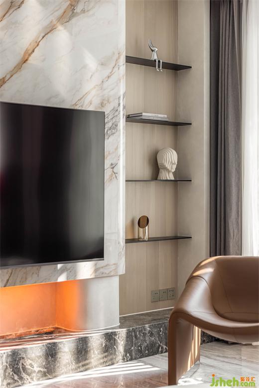 电视墙采用岩板热弯工艺,南京家装设计沉静温润的石材与下方壁炉跃动的火苗相映成辉,既动且静,自成一景。