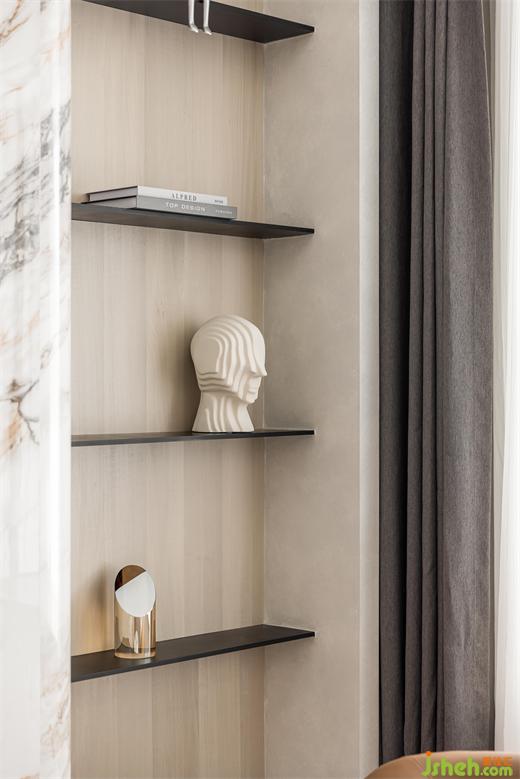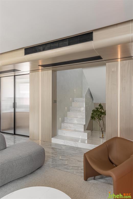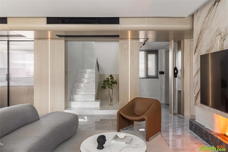 墙面木色延伸至顶,增加空间纵深感,南京家装设计墙面内嵌线性灯,功能性与装饰性相结合。