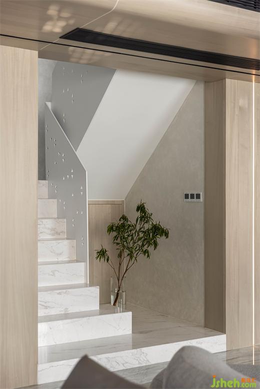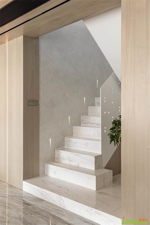 定制的铁艺镂空扶手,让楼梯区域更加轻盈通透,感应踢脚灯令上下楼更为便捷。