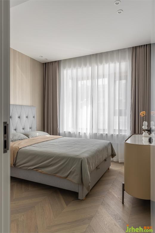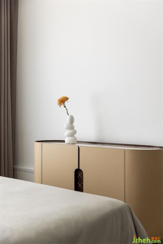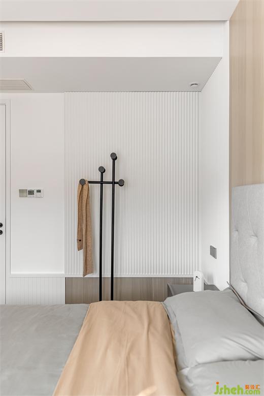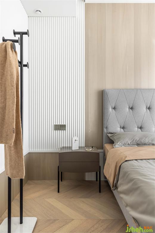 客房延续公共空间的色调,南京家装设计床头背景木饰面板装饰,结合烤漆波浪板,增加墙面层次感。