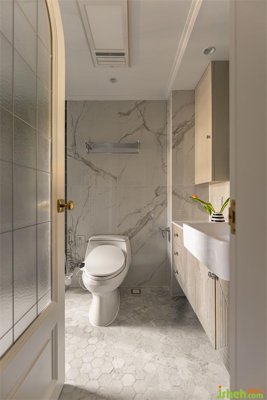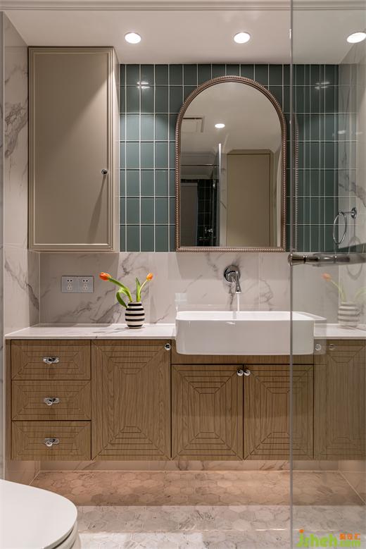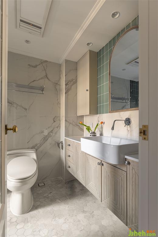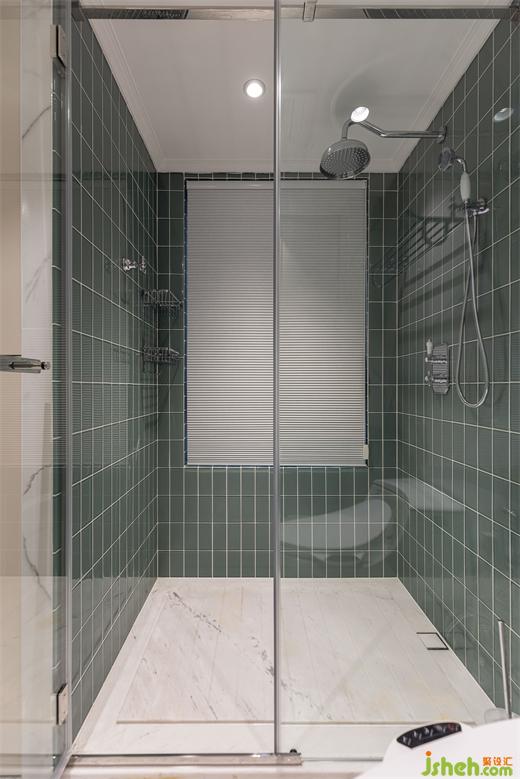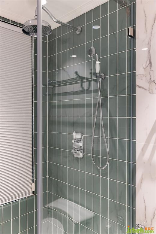 主卫绿色小花砖与白色通体大砖搭配时尚个性,装修设计银色系五金风格统一,精致耐看。