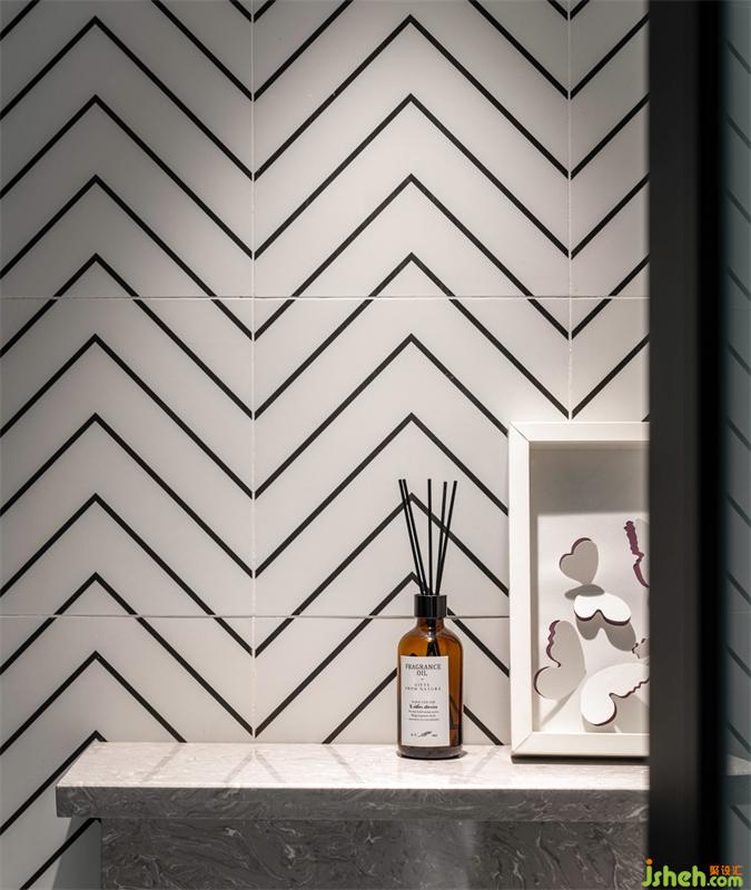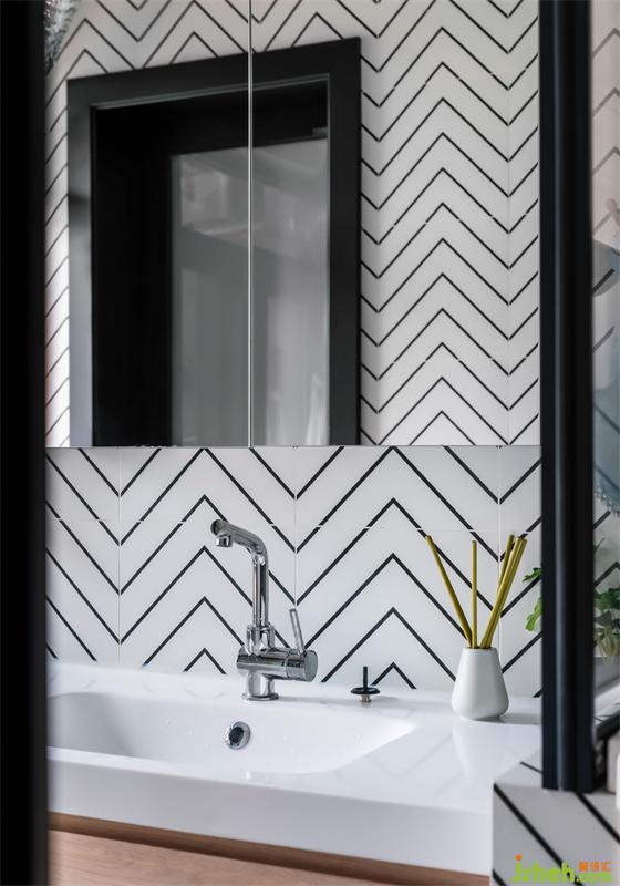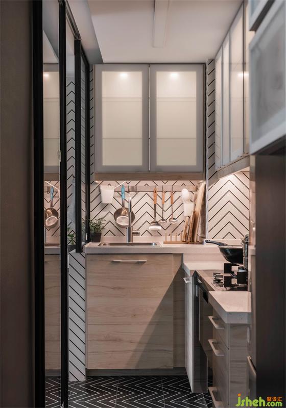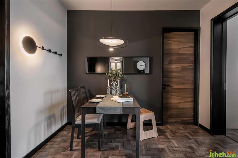 黑色的艺术墙面从客厅一直蔓延到餐厅并一直延伸到厨房,天棚嵌入的暗光照明舒解空间的深色冷冽感,同时也将狭长的厨房增加了层次感,在台面的装修设计上特意将水池区高度提到90com大大提增实用性和舒适性,隐藏式收纳柜产生极简视野。