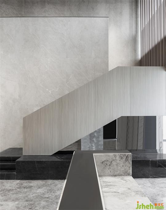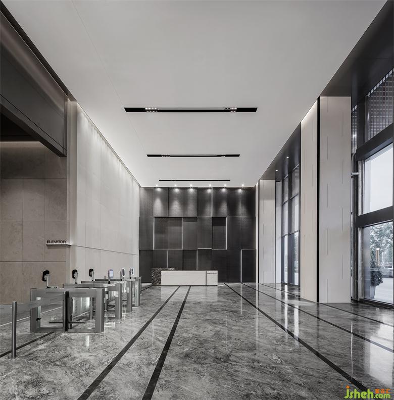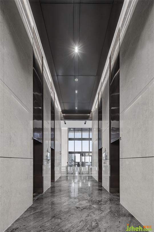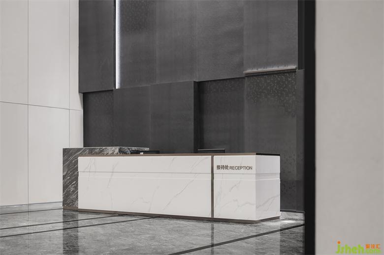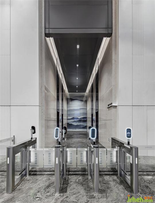 写字楼背景墙运用石墨色的岩板塑造参差堆叠的墙体,总部办公室设计配合灯光的运用,丰富视觉层次。在电梯厅入口处,一幅玻璃山水映入眼帘,奠定了整个项目的基础调性。