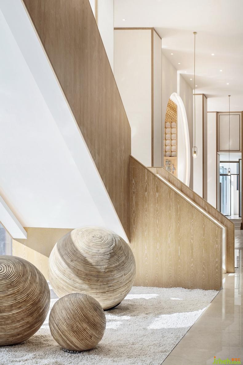 穿过廊道,行至正厅,月洞门式的隔断起到奇特的视觉连通作用,构成虚实相生的髙敞空间。室内设计师原木系的松枝凭栏斜倚,喜迎八方客至,暗示一派极境边城的闲适与安然。