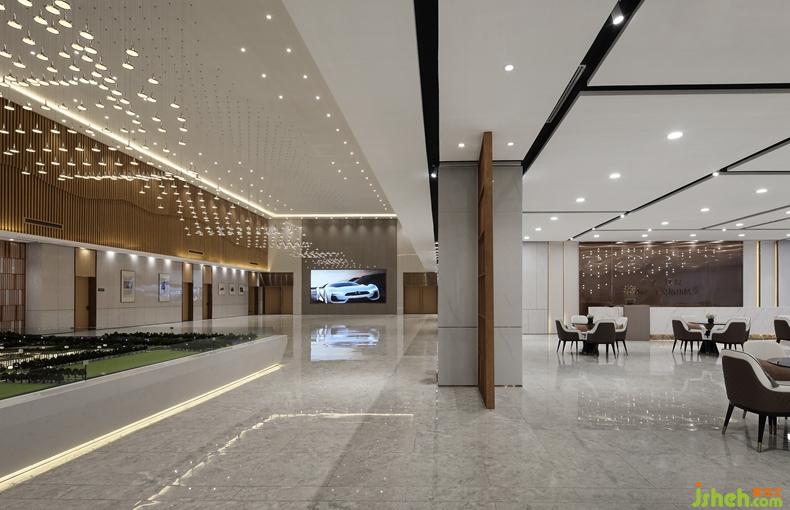 所有的功能分区以入口到正厅沙盘区的轴线呈对称分布,髙敞的沙盘区空间以木质和灰色大理石为主调,开敞大气,室内设计师再通过金属材质的木色屏风和其他的开放空间形成基础的隔断,充满视觉张力。