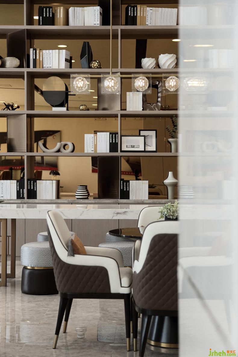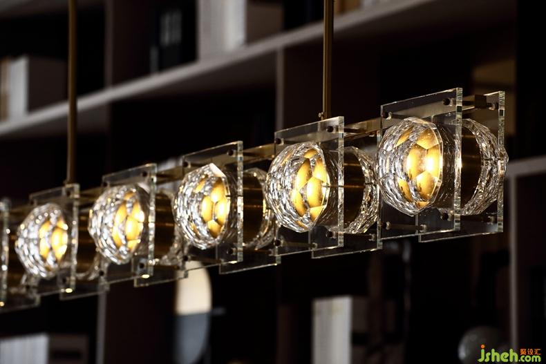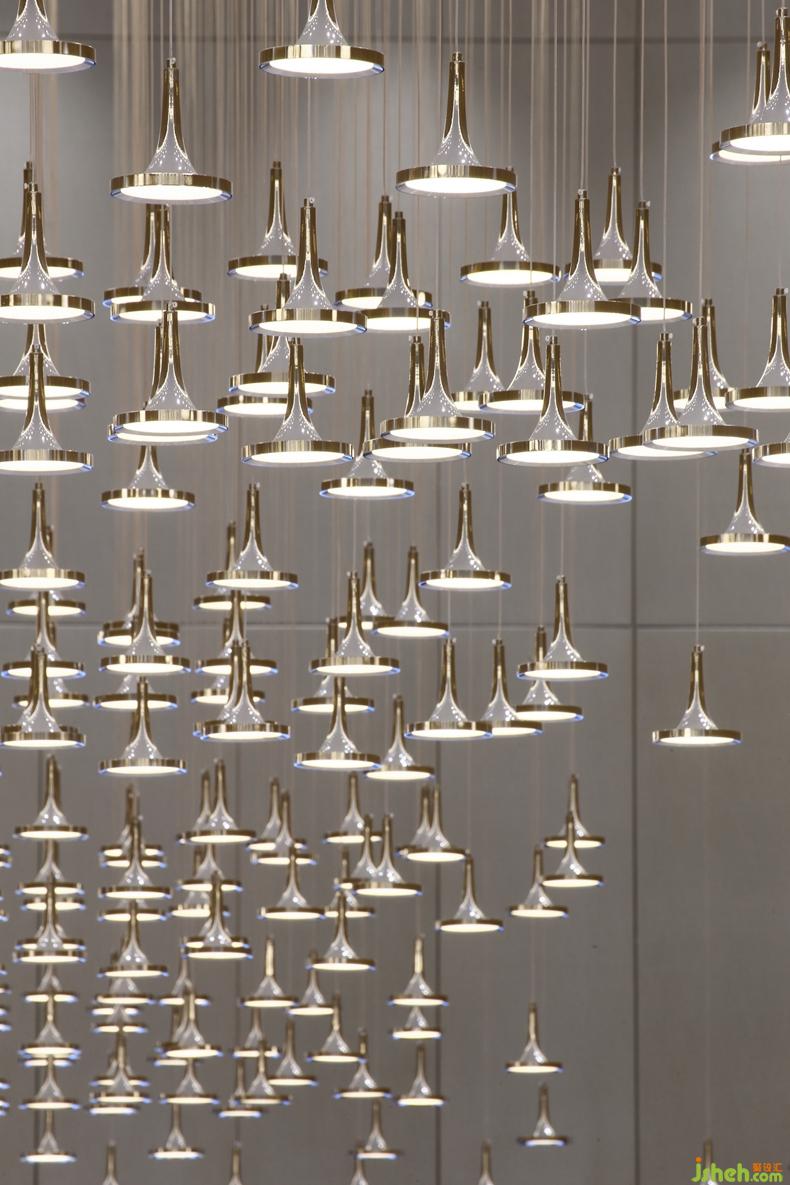 室内设计师希望通过软装的细部陈设来体现整体设计的空间质感与低调奢华,无数的小型金属灯饰成为这片空间最亮眼的元素组合。金属吊灯的整体造型源自汽车车身的流线和汽车飞驰时轨迹的变换,轻盈而灵动,整片金属帘幕悬挂在天花犹如满天的星光从星空缓缓垂落,流动的趣味尽显,自然姿态与现代感共融。