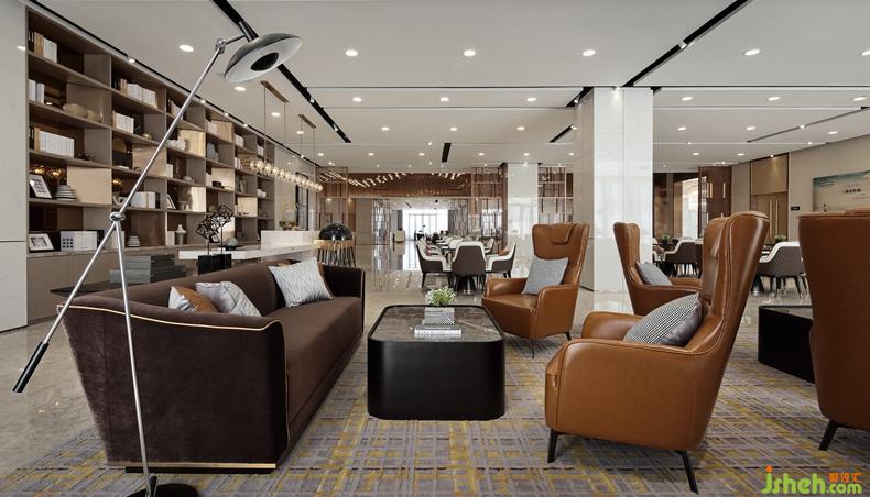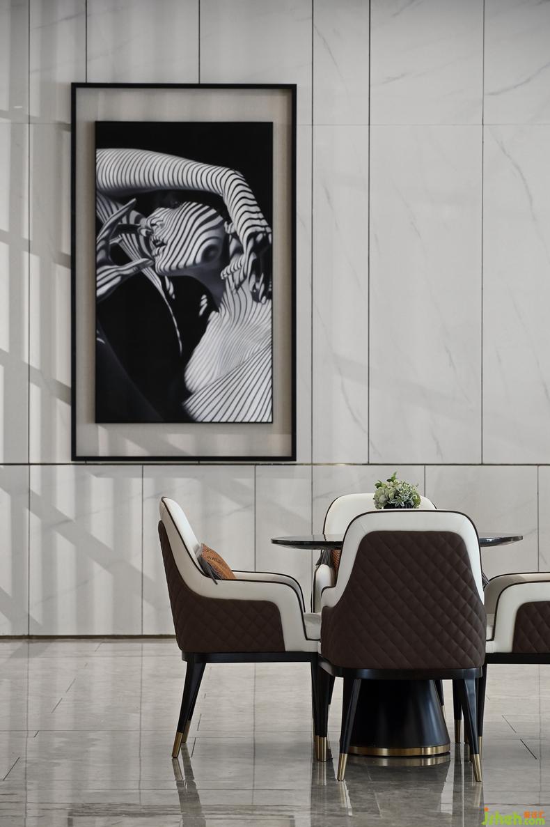 洽谈区分布于正厅沙盘区的两侧,以天花中间隐藏的黑色灯带和承重的立柱围合成不同的恰谈空间,自然有序。