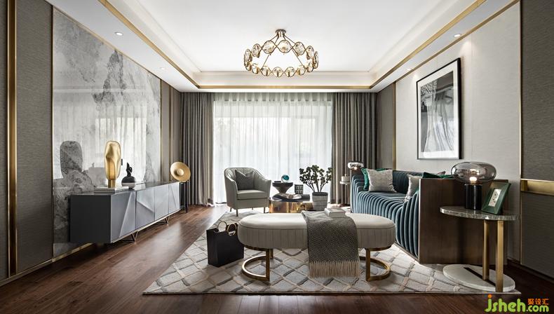 客厅的电视背景墙,香槟金木饰面与灰纹大理石形成搭配,以柔和分明的线条勾勒生活质感,丰富多样的饰品摆件诠释着最轻奢的都市生活格调和诉求。