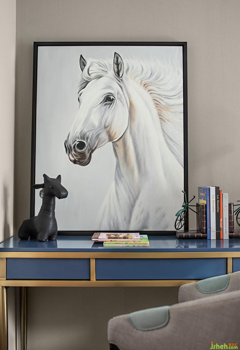 在儿童房的软装陈设上,设计仍然以蓝色为主调,同时融入动感的马术元素,为空间增添活力。