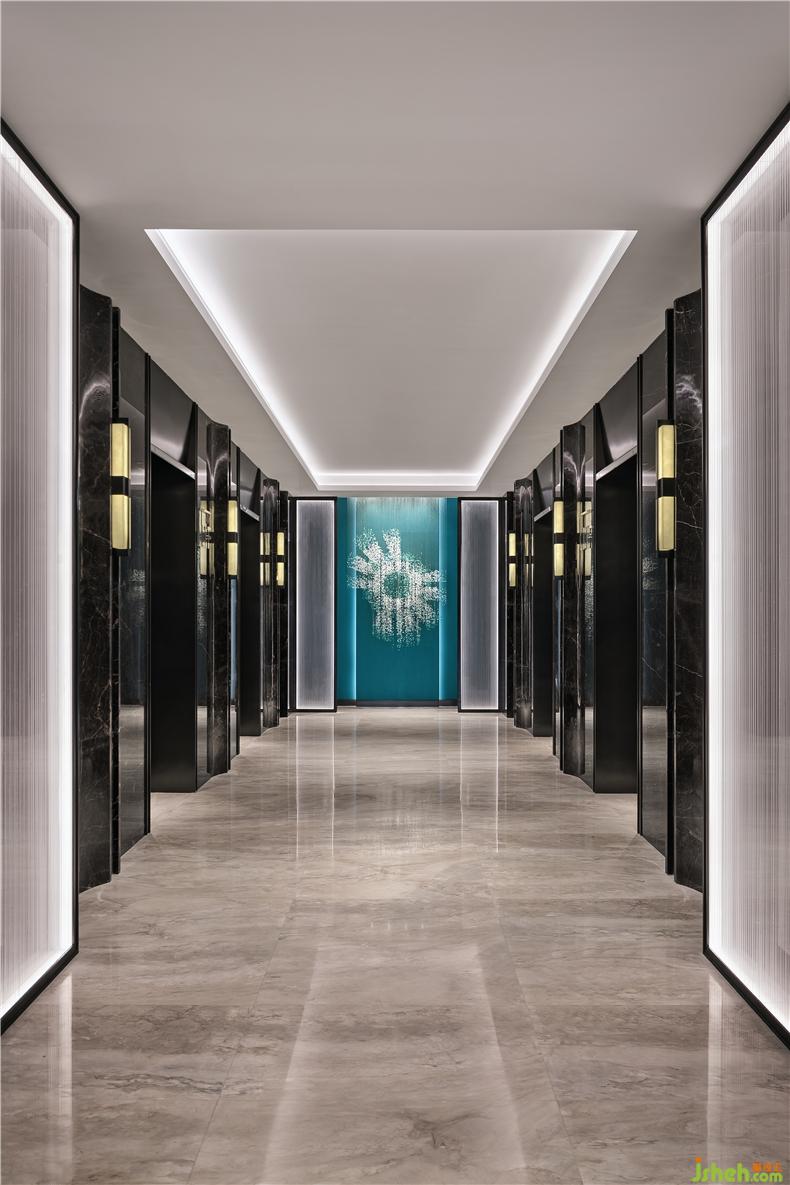 电梯厅给人以时空隧道般的未来感,酒店设计空间尽头的组合灯饰延用了大堂的抽象齿轮元素。