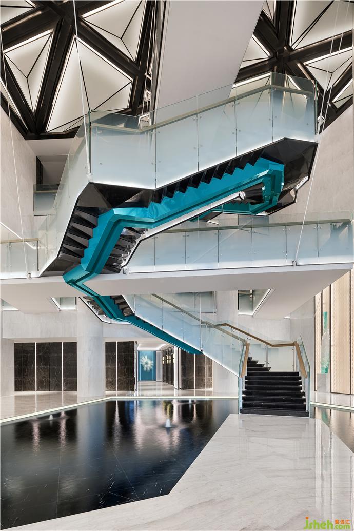 接待大厅像是一个轻轻漂浮空中的巨大艺术盒子。钻石切面延续了入口的菱形,截取纹理的精致墙面层层铺叠,可以变换颜色的光影,让空间粼粼流淌起来。抽象演绎的齿轮元素被设计师融入蓝绿色背景墙的钟盘造型设计中,寓意以时间铭刻城市历史。酒店装修设计