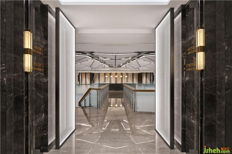 行至二层,空间中天花的设计由杭州绵延起伏的山体倒置演绎而来,酒店设计整个空间以黑白描绘,形态肌理的变化呈现出丰富多元的空间感知。