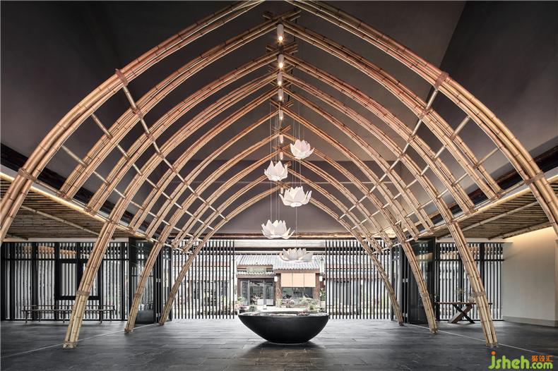 佛家有言,水生莲,莲生万物,步入接待中心,竹制拱形造型与莲花艺术装置映入眼帘,花间见禅,物物融于造化,此取意化境“曲径通幽,步步生莲”。往来视之,清心悦神,借景以修身养性,而尘心渐息,最终归于宁静。