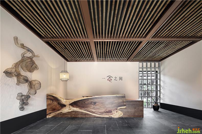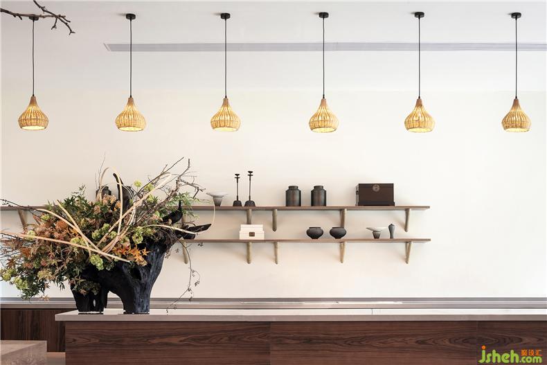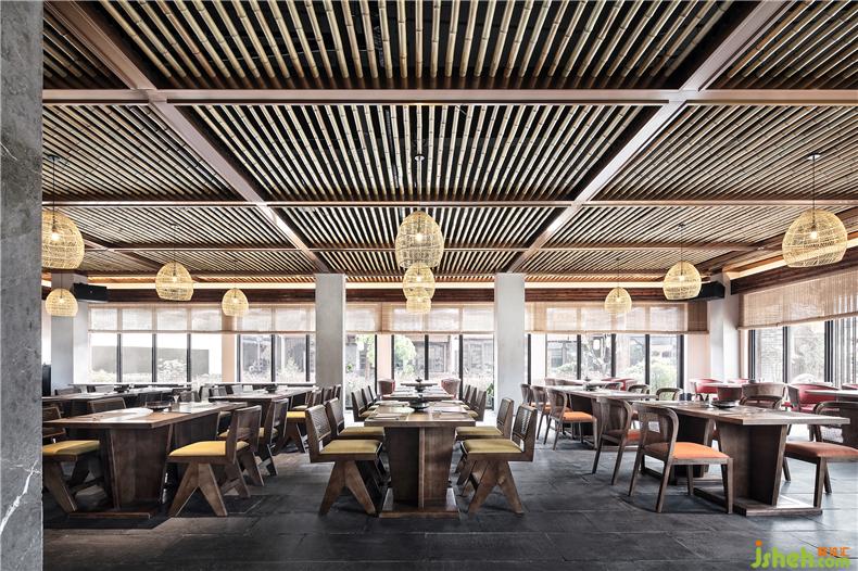 入口处,取自田间的南瓜瓜藤被巧妙用作空间中的艺术装置,演绎田园之乐。整个空间辅以大量的竹木,意蕴古朴,光影变化中,增添了清新和雅气息。