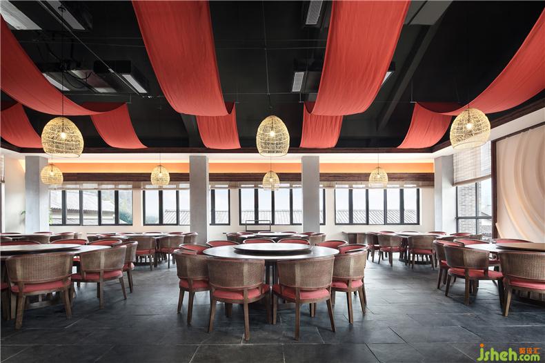 一楼素食餐厅色调暖黄,曰晨,曰向阳,寓意初生的太阳,一日之晨,酒店设计生机无限;二楼的荤食餐厅则色彩浓烈,红色彩带如行云流水般点缀其间,起心念,动食指,喷薄而热烈,充满能量。设计师希望人们在用餐时懂得珍惜和感恩。
