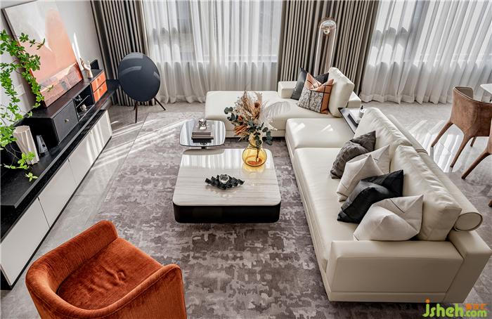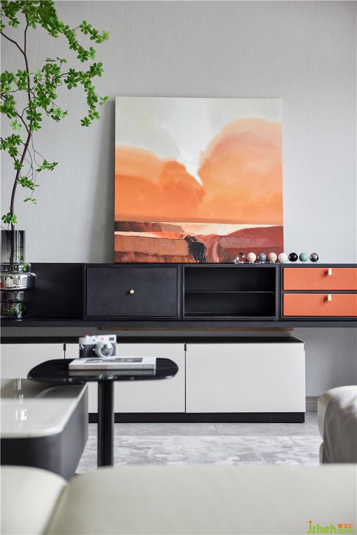 站在客厅观“落日”,有暖意;落座沙发椅,有暖橘包裹,样板房设计交流有了温度。作为会客交流的区域,层次温润的暖橘倾泻而出,跳跃于灰白调之间,沙发椅与油画是视觉的艺术焦点,成为妆点空间的火花。