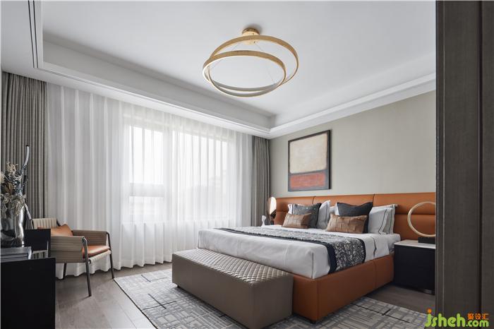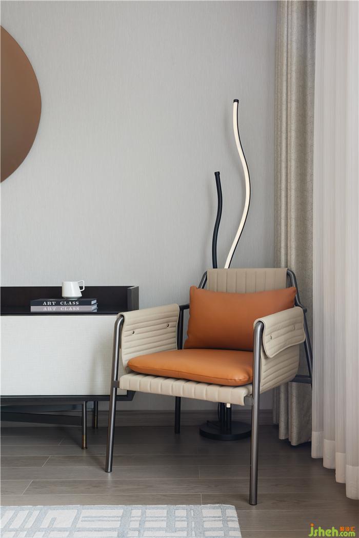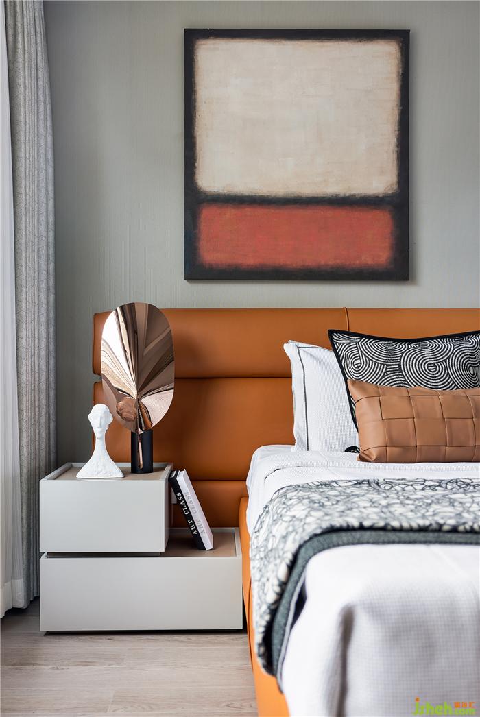 卧室延续了轻奢典雅的基调,明亮搭配有序,雾灰与暖橘,皮质与金属,样板房设计空间整体色调徜徉着诗意的光感。阳光倾洒,光影和谐,方圆之间是望得见的烟火气息。
