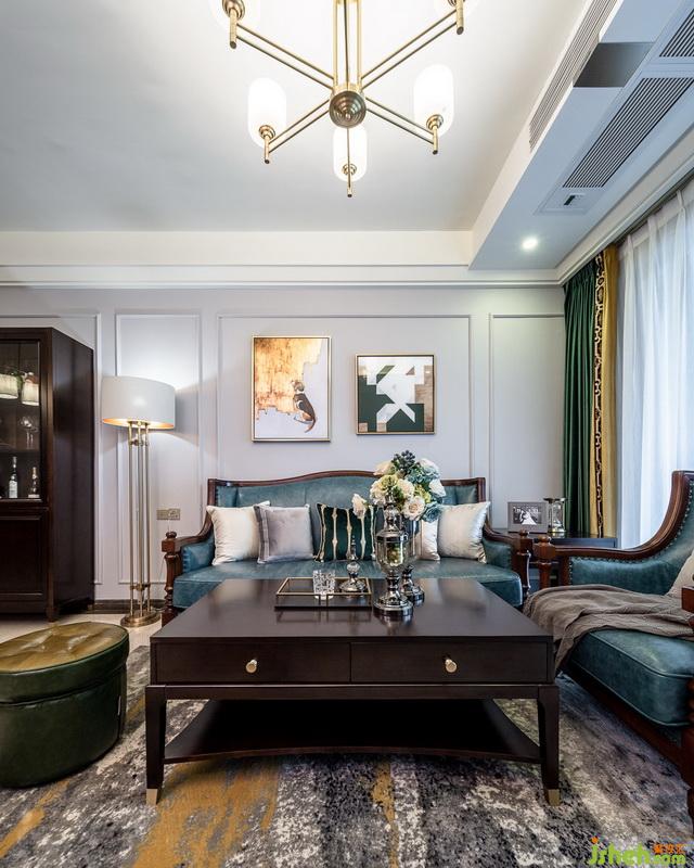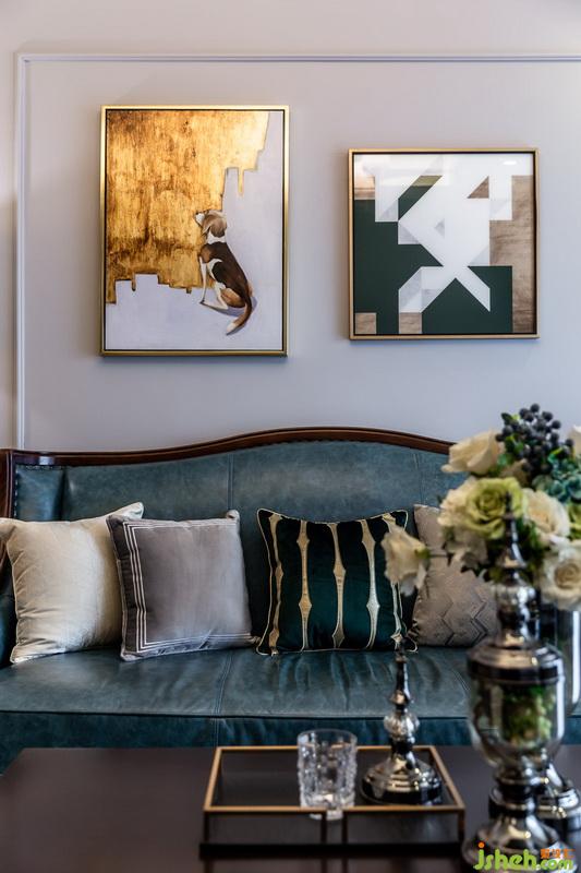 沙发整套都从原来住所搬过来的,传统的美式。放在现在空间里有点太重,只有通过其他物件来拉低它原有的笨重;如金色边框的装饰画、超细的沙发背景框、台灯还有金属脚的茶几。