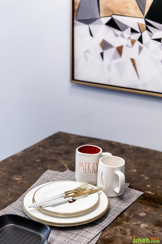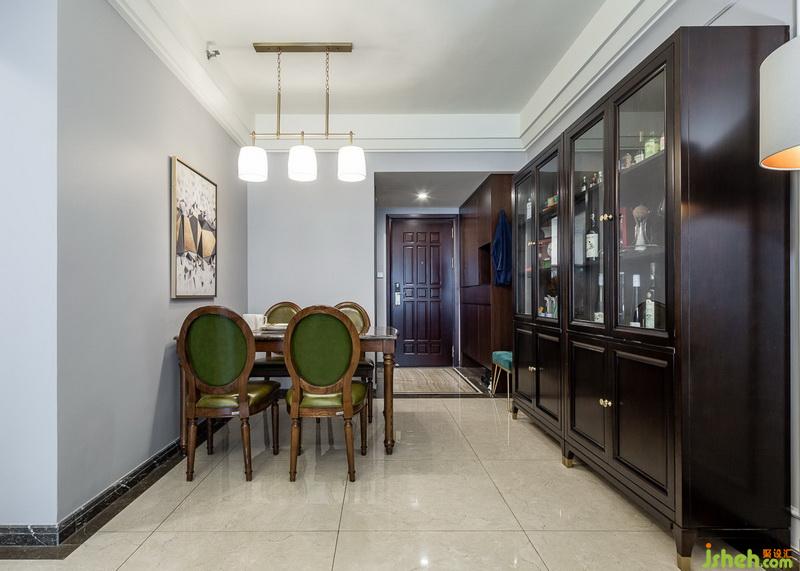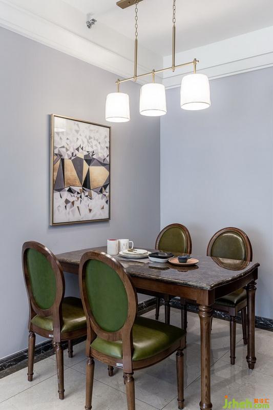 原有的餐桌也是传统美式的设计,同样用金色边框的装饰画,再加上黄色的几何配图。绿色的凳子呼应着绿色的窗帘和客厅装饰画,黄色的装饰画也连接着窗帘和装饰画。
