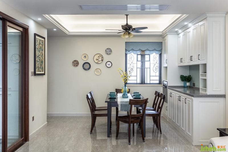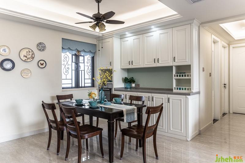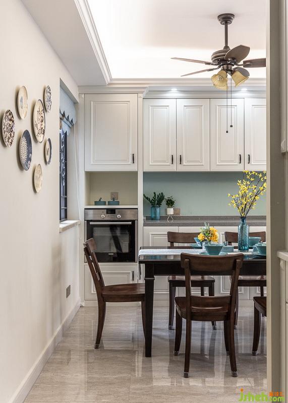低调大气的黑胡桃餐桌和餐椅显得精致而典雅,餐厅背景的电器高贵和餐边柜不仅纳入了烤箱还提供了强大的收纳功能。