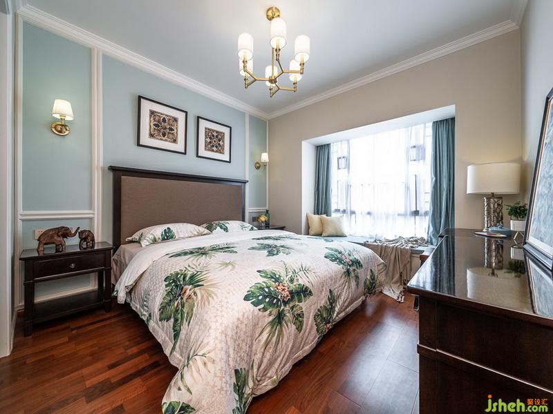 主人房的墙面设计师选用精美石膏线和浅蓝色墙面背景相结合,黑胡桃的实木家具,柔软雅致的棉质床品,遮光度达到90%的棉麻窗帘营造了温馨宁静的氛围空间,整体融合的色彩,可以让主人卸下一整天的疲惫,缓缓进入梦乡。