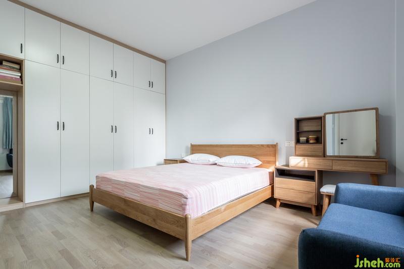 浅灰色调主卧,搭配深蓝色休闲沙发,配上天蓝色窗帘,静谧中体现着细致,无处不让人感受着温暖与宁静。