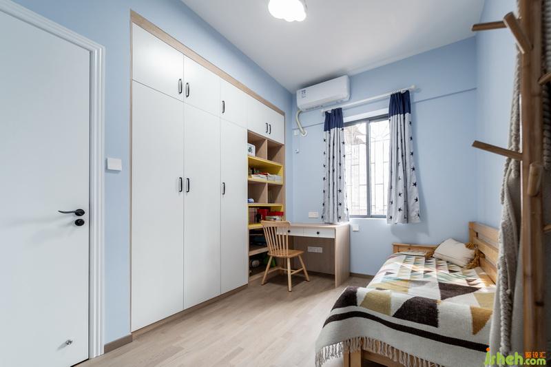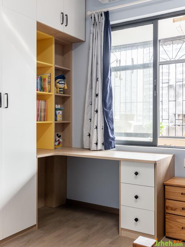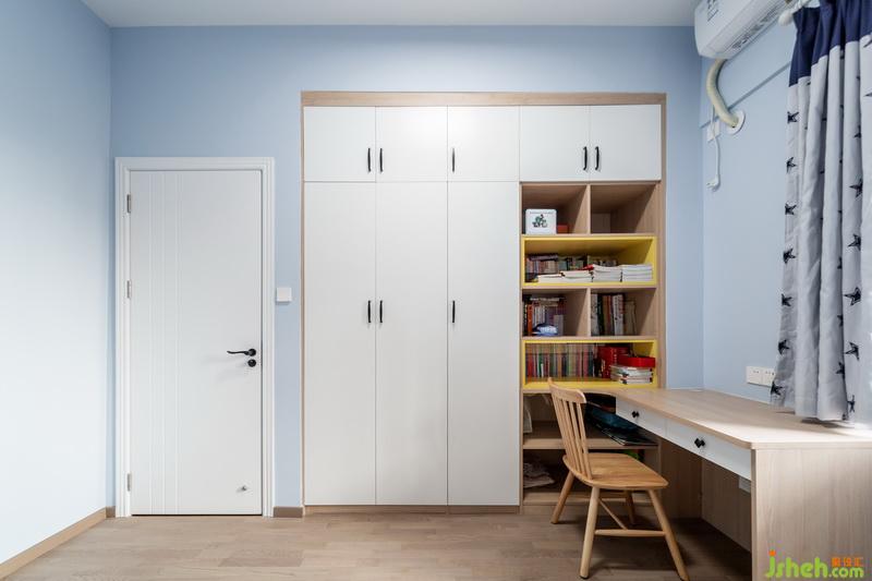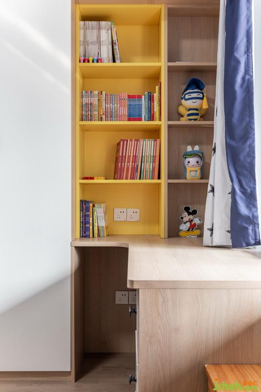 天蓝色的墙壁,云朵造型的灯。黄色层板将书柜点缀得充满生气与活力,正适合小男孩聪明活泼的性情。