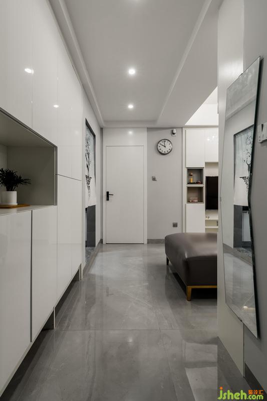 入户位置做了一个到顶的大鞋柜作为入户的收纳,并利用进门右手边的柱子安排出一个悬挂穿衣镜的空间。