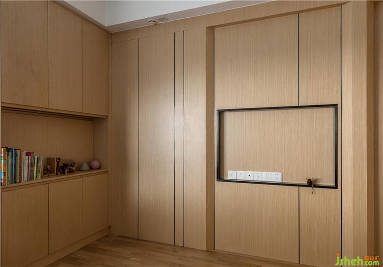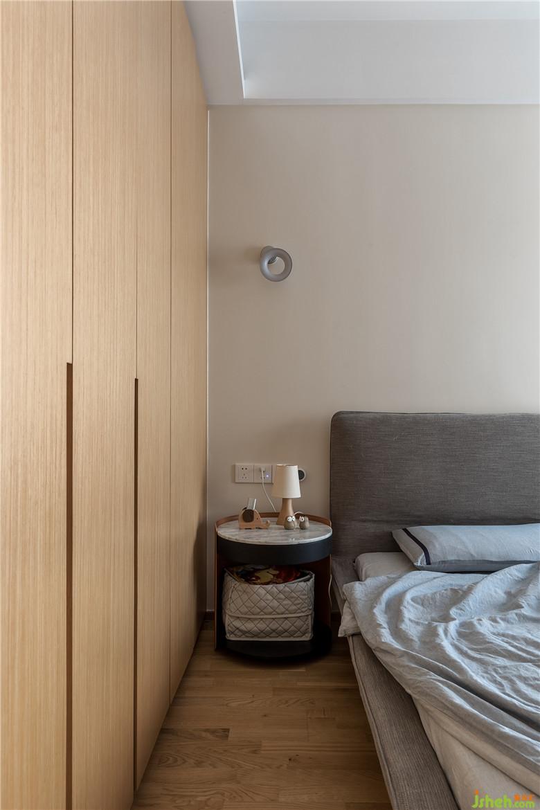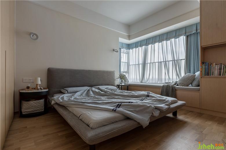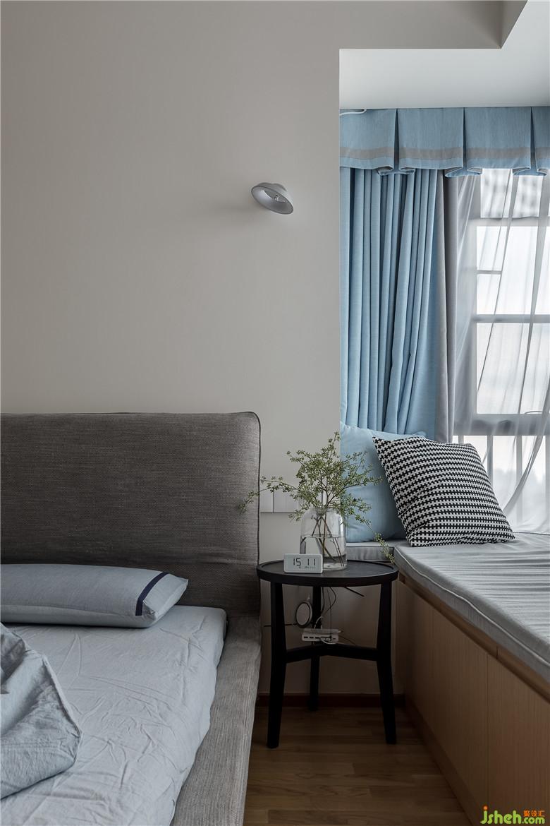 室内设计师在木色与灰色搭配的基调上,窗帘选用浅蓝色,利用储物柜加宽的休闲飘窗成了很好的休憩场所。浅蓝色窗帘被风杨起的时候,看着窗外湛蓝的天空,会觉得分外幸福。
