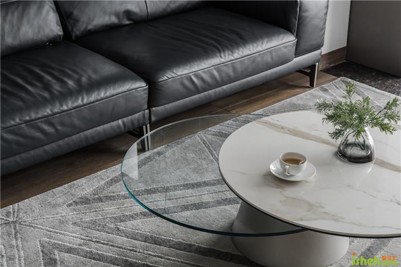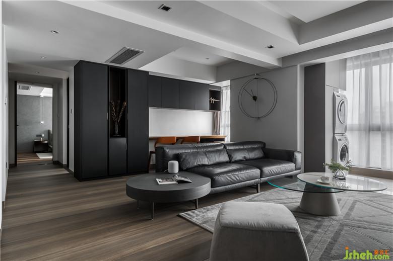 极简与冷静碰上一发不可收拾,整个空间除去了纷繁复杂的装饰,开阔通透延续的空间视觉感,表达了极简主义的理性追求之美。灰色皮质沙发,玻璃圆茶几,炫彩油画的组成便成了客厅夺目的存在;一本杂志,一杯咖啡,就是单身狗男主人的日常写照,在这里他找到了属于自己的精神领域。