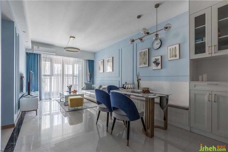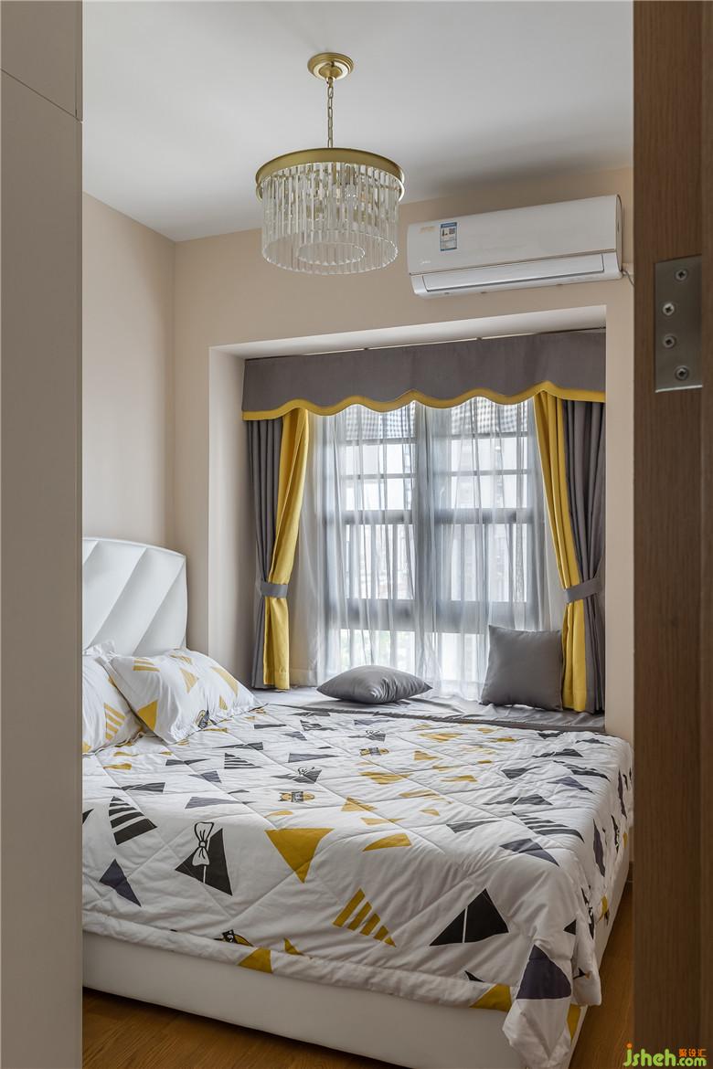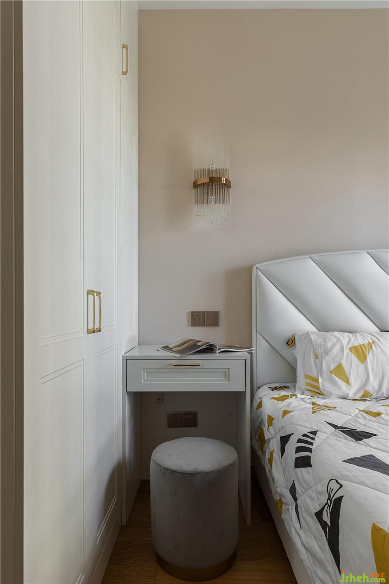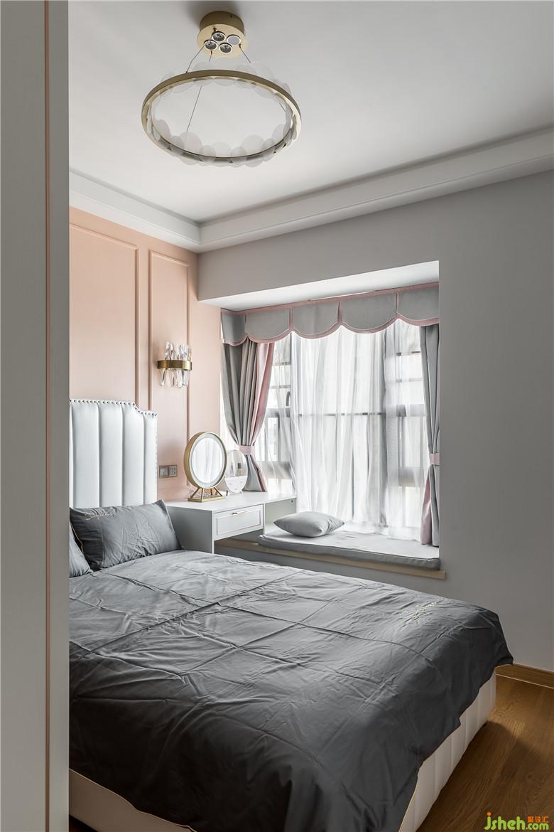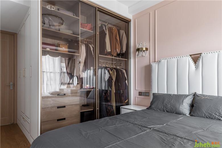 床头背景以甜蜜温馨的烟粉色为主调,延伸客餐厅的石膏线条,其他墙面以浅灰色为辅,中和烟粉色带来的甜腻,大面茶色玻璃衣柜使空间通透性更好,柜体里面的层板都有灯带,透过里面的灯光,从外面看质感是很高级,也是主人喜欢的轻奢感。