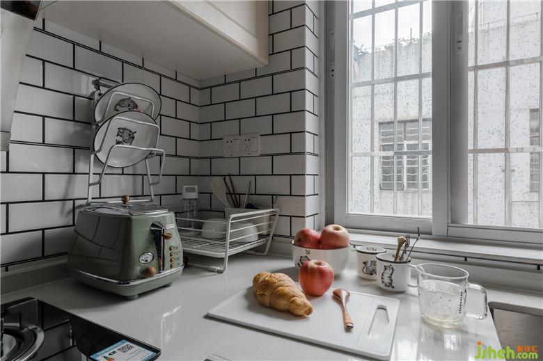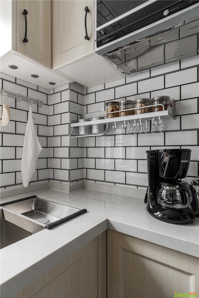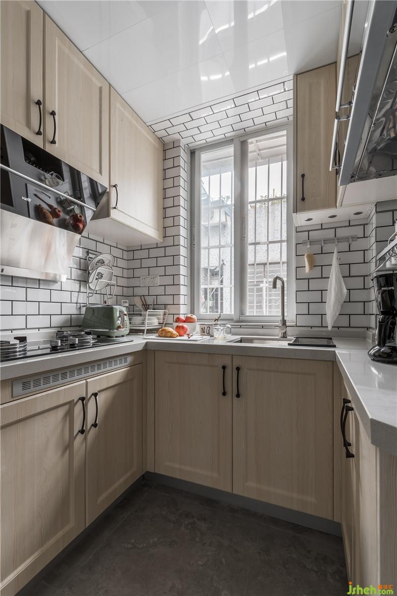 白色小方砖与浅色橡木的橱柜,扩大厨房的空间感,U型的橱柜设计,足够满足小户型储藏量大的功能需求