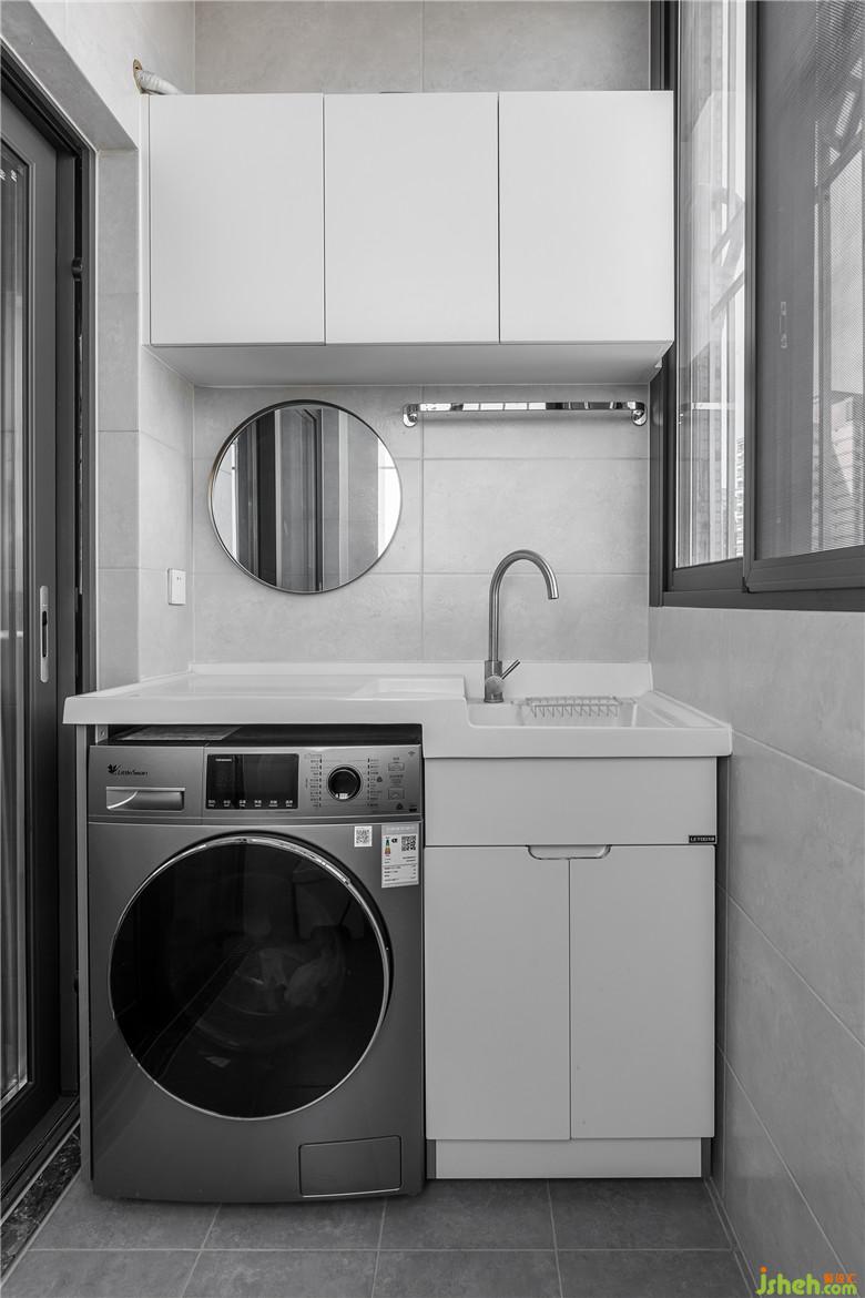 阳台的空间当然也不能浪费,白色洗衣机柜与灰色地面瓷砖搭配显得简单大方