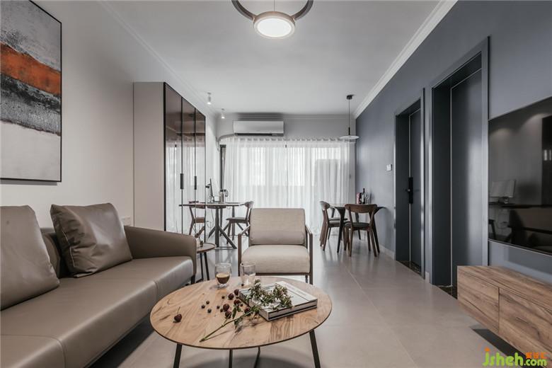 客厅;深灰色系的沙发显得大气沉稳,沙发上方的带有橙色的装饰画,装修公司给空间带来一些活跃性,使空间充满节奏感,不因重色家具而带来沉闷,木质与皮质的碰撞,空间充满独特格调,这些有质感的家具,让这对小夫妻的生活从一开始就充满仪式感。