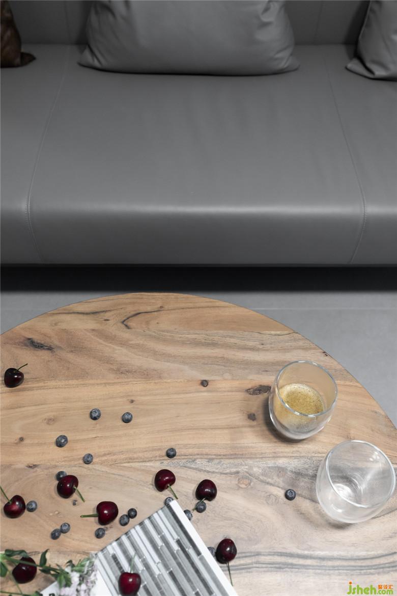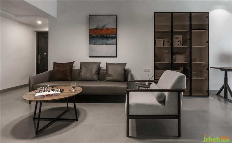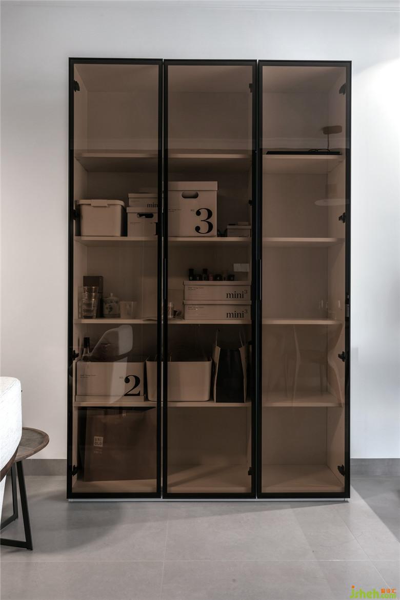 餐厅;深色的餐桌餐椅与灰蓝色的墙面搭配,充满轻重缓急的节奏感,旁边的置物柜,透明玻璃的柜门,简单利落柜体线条
