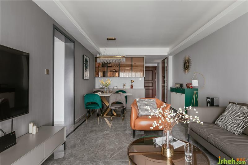 经过室内设计师改造,质感兼具颜值的现代轻奢风形成了。整个空间采用灰色调为主体,用亮色作为突出的色彩,大理石金属元素成了轻奢高级的代表。